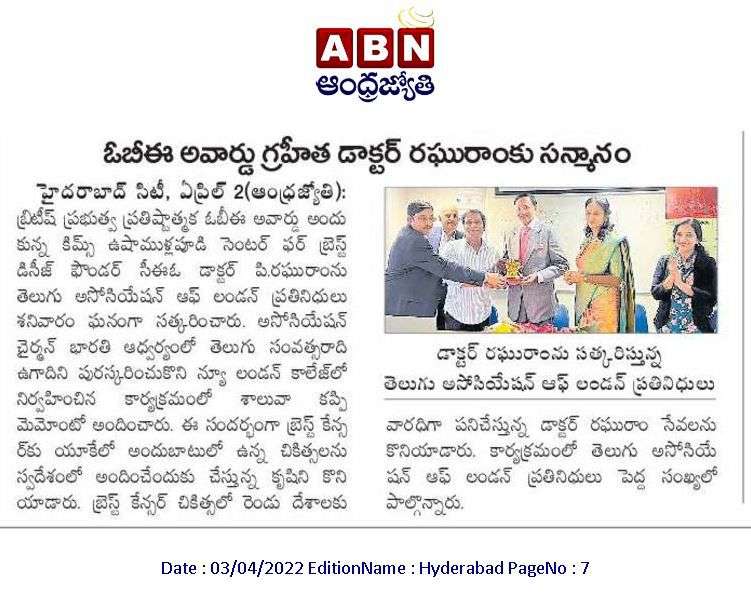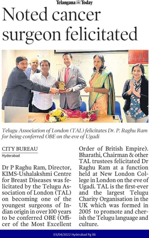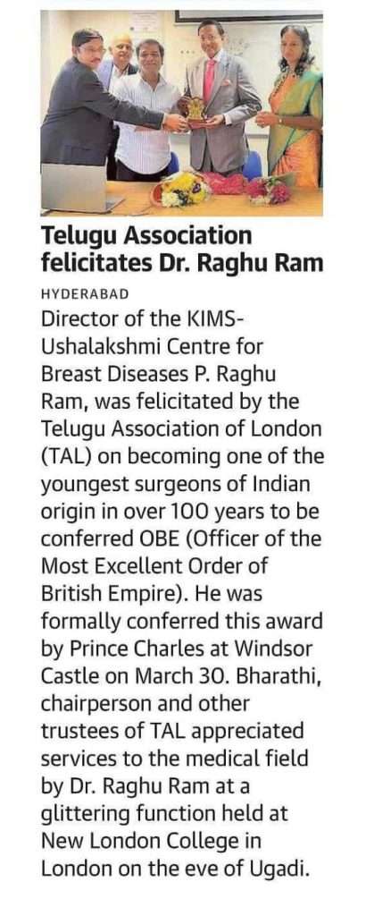 Dr. P. Raghu Ram, Director, KIMS-USHALAKSHMI Centre for Breast Diseases was felicitated by the Telugu Association of London (TAL) on 1 April 2022 for becoming one of the youngest surgeons of Indian origin in over 100 years to be conferred OBE (Officer of the Most Excellent Order of British Empire). He was formally conferred this award by His Royal Highness, Prince Charles at Windsor castle on 30 March 2022.
